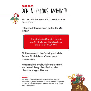 Wir freuen uns riesig – am 06.12. erwartet unsere kleinen Schwimmerinnen und Schwimmer ein ganz besonderer Gast: Der Nikolaus besucht uns im Schwimmbad!
